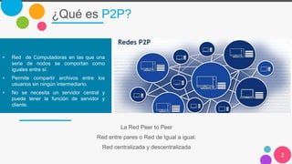 El documento describe el modelo de red Peer to Peer (P2P), que permite el intercambio directo de archivos entre usuarios sin necesidad de un servidor central. Presenta ventajas como reducción de costos, ausencia de comisiones a intermediarios y la capacidad de administrar dispositivos de forma independiente. También se realizan análisis de mercado y buyer personas, destacando la necesidad de crear espacios cómodos y seguros para trabajar, especialmente en entornos ruidosos y con tráfico.