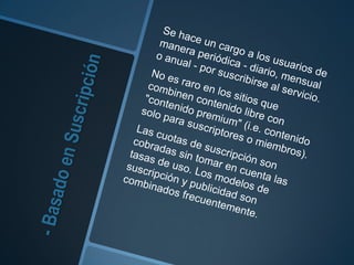 Este documento describe diferentes modelos de negocios basados en Internet, incluyendo modelos basados en suscripción y en la explotación de información. Los modelos basados en suscripción cobran cuotas periódicas a los usuarios por el acceso a contenidos o servicios. Los modelos basados en la explotación de información generan ingresos al recopilar y vender datos sobre los hábitos y preferencias de los usuarios.
