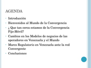 El documento describe los conceptos y tecnologías clave para lograr la convergencia fijo-móvil, incluyendo IMS, UMA y redes NGN. Explica cómo estas tecnologías permitirán a los usuarios acceder a voz, video y datos desde cualquier dispositivo y ubicación a través de una red integrada. También analiza los cambios en los modelos de negocio de los operadores y las implicaciones regulatorias de la convergencia en Venezuela.