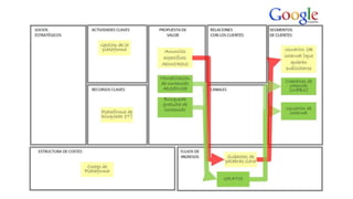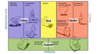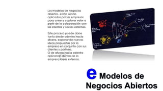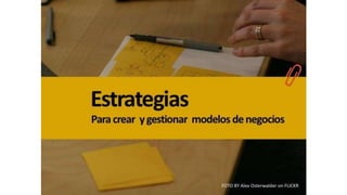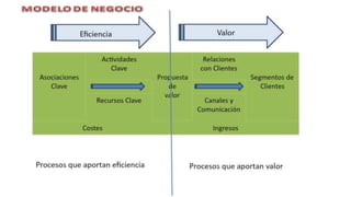 El documento discute los modelos de negocio y cómo son fundamentales para el éxito empresarial. Explica que 52% de los fracasos empresariales se deben a problemas con el modelo de negocio. Un modelo de negocio efectivo describe quién es el cliente, qué oferta recibe a cambio de pago, cómo y dónde recibe la oferta, cuánto paga, y cómo la empresa genera ingresos. Un buen modelo de negocio también considera los recursos, actividades y asociaciones clave de la empresa.