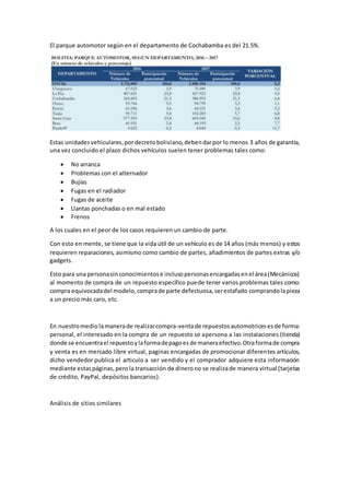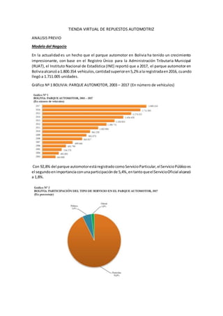 Este documento analiza la viabilidad de una tienda virtual de repuestos automotrices en Bolivia. Señala que el parque automotor boliviano ha crecido significativamente en los últimos años y que los vehículos requieren con frecuencia repuestos y reparaciones después de los 3 años de garantía. Actualmente, la compra de repuestos requiere visitar tiendas físicas y pagar en efectivo, lo que consume tiempo y no brinda información ni garantías sobre la calidad de los productos. La tienda virtual propone resolver estos problemas ofreciendo información sobre repuestos