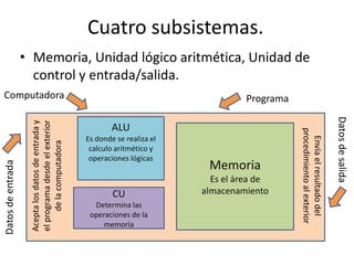 El documento describe los principales componentes de una computadora, incluyendo la memoria, unidad lógica aritmética, unidad de control e input/output. También describe los dispositivos de entrada como teclado, mouse y cámara, y los dispositivos de salida como monitor e impresora. Por último, explica varios dispositivos de almacenamiento como disco duro, CD, DVD y memoria USB.
