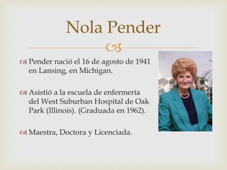 El modelo de promoción de la salud de Nola Pender se basa en factores interpersonales e intrapersonales que influyen en los comportamientos de salud. Estos factores incluyen la autoeficacia, las experiencias pasadas, los beneficios y barreras percibidos, y las influencias sociales. El modelo propone que adoptar estilos de vida saludables depende de cómo las personas evalúan estos factores y deciden comprometerse con un plan de acción.