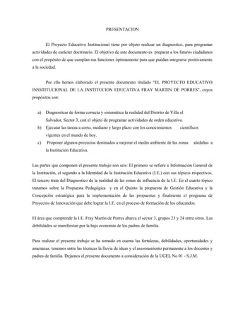 El documento presenta el Proyecto Educativo Institucional de la Institución Educativa Privada "Fray Martín de Porres" para el periodo 2011-2016. El PEI tiene como objetivo diagnosticar la realidad del distrito de Villa El Salvador y programar actividades educativas. El documento describe la identidad de la institución, su misión, visión y principios filosóficos, y presenta un diagnóstico de la situación actual y objetivos estratégicos para mejorar la gestión pedagógica, institucional y administrativa.