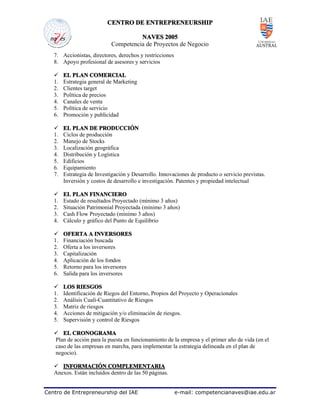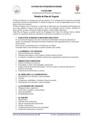 Este documento presenta un modelo de plan de negocio que incluye secciones como el resumen ejecutivo, la empresa y el negocio, productos o servicios, el mercado y la competencia, la economía del negocio, el equipo, el plan comercial, el plan de producción, el plan financiero, la oferta a inversores, los riesgos, el cronograma e información complementaria. El plan de negocio es una herramienta para modelar el negocio, prever el futuro y atraer fondos al proyecto.
