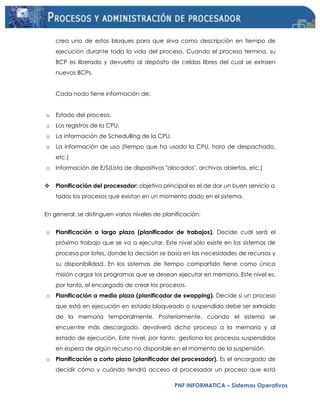 Para permitir la multiprogramación y la concurrencia, los sistemas operativos usan un modelo de procesos con bloques de control del sistema y del proceso. El bloque de control del sistema almacena información sobre los procesos y recursos, mientras que el bloque de control del proceso almacena información específica de cada proceso como su estado y uso de recursos. El planificador del procesador asigna tiempo de CPU a corto plazo a los procesos preparados para ejecutarse.