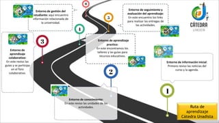 El documento detalla los diferentes entornos de aprendizaje en la universidad, incluyendo gestión del estudiante, seguimiento y evaluación, aprendizaje práctico, colaborativo y conocimiento. Se proporciona información sobre dónde encontrar links para entregas, talleres, guías, y recursos educativos. También se menciona la importancia de revisar las noticias del curso y la agenda como parte del entorno de información inicial.