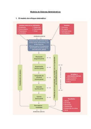 1. El documento describe diferentes modelos de sistemas administrativos, incluyendo el enfoque de sistemas en la administración y la teoría general de sistemas. Describe las organizaciones como sistemas abiertos que interactúan con su entorno, y que están compuestas de subsistemas interdependientes que trabajan juntos para lograr un objetivo común.
