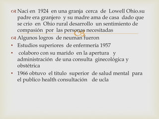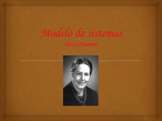 El documento describe la vida y logros de Betty Neuman, así como su modelo de sistemas en enfermería. Neuman nació en 1924 en Ohio y desarrolló una teoría basada en sistemas abiertos. Su modelo conceptualiza a la persona, entorno, salud y enfermería, y propone niveles de prevención. El modelo ha sido ampliamente aceptado y utilizado para guiar el cuidado de enfermería.