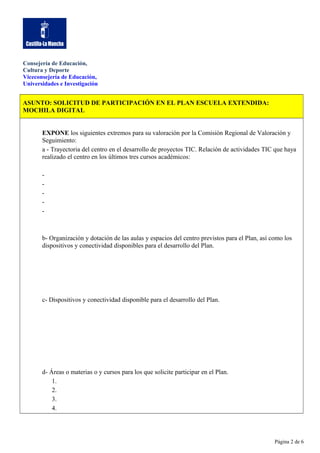 El documento es una solicitud de un centro educativo para participar en el Plan Escuela Extendida: Mochila Digital. En la solicitud, el centro describe 1) su experiencia previa con proyectos TIC, 2) la organización y dotación tecnológica del centro, 3) las áreas y cursos para los que solicitan participar, y 4) las medidas de formación del profesorado y difusión entre la comunidad educativa. El centro se compromete a ofrecer el modelo digital hasta final de Primaria y ESO e impartir un mínimo de cinco