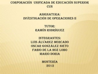Este documento presenta un problema de minimización de costos de transporte de electricidad desde tres centrales de distribución hacia tres ciudades. Se dan los costos de transporte entre cada par origen-destino y la demanda de cada ciudad. El objetivo es determinar la distribución óptima que minimice el costo total de transporte satisfaciendo la demanda de cada ciudad. Se plantea el modelo matemático con las variables de decisión, restricciones de oferta y demanda, y la función objetivo a minimizar. Finalmente, se resuelve el problema mediante el método del costo