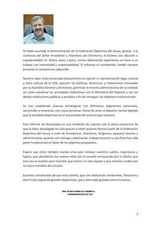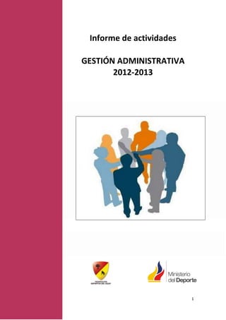 El informe resume las actividades administrativas de la Federación Deportiva del Azuay durante 2012-2013, incluyendo la gestión de recursos humanos y aspectos técnicos. Se realizó un diagnóstico de los recursos humanos que identificó oportunidades de mejora como falta de normatividad interna y coordinación. Se presentó un plan para 2013 enfocado en la contratación, capacitación y bienestar del personal. El departamento técnico se enfocó en la planificación y control de procesos deportivos así como la tabulación de resultados.