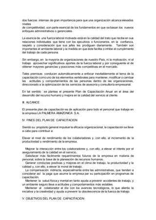 El documento presenta el Plan de Capacitación y Desarrollo de Recursos Humanos de LA PALMERA AMAZONICA S.A. para el segundo semestre de 2005. El plan busca elevar el rendimiento de los empleados a través de capacitaciones que cubran las necesidades identificadas. El documento explica los objetivos, alcance, estrategias y tipos de capacitación incluidos en el plan para mejorar el desempeño y servicio al cliente.