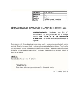 Este documento contiene dos escritos presentados ante un juez de paz. El primer escrito adjunta edictos publicados en un periódico local como parte de un proceso de extinción de obligación alimentaria. El segundo escrito adjunta una cuenta corriente bancaria relacionada con la misma causa, solicitando que sea considerada antes de emitir una sentencia.