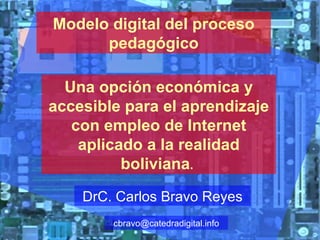 El documento describe un modelo digital para el proceso pedagógico aplicable a las aulas digitales en Bolivia. Propone utilizar la plataforma Moodle de forma gratuita y con código abierto. El modelo se basa en enfoques histórico-culturales y de sistemas, y se caracteriza por ser organizado, sistémico, colaborativo e integral. El modelo organiza el trabajo en el aula digital a partir de un texto digital con mapas conceptuales, contenidos, actividades y evaluaciones.
