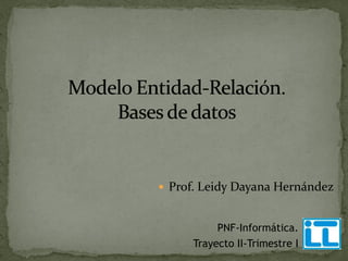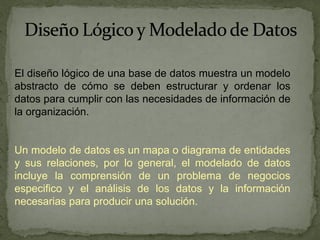 El documento describe los conceptos fundamentales del modelo entidad-relación (ER) para el diseño de bases de datos, incluyendo entidades, atributos, relaciones, cardinalidades y su representación gráfica. Explica que el modelo ER fue creado por Peter Chen en 1976 y permite modelar los datos de un sistema mediante diagramas que expresan las entidades, sus atributos y las interrelaciones entre ellas.