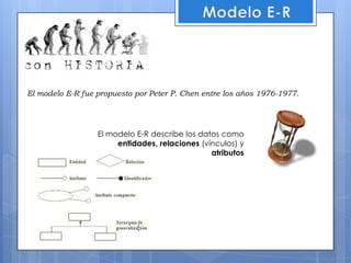 El documento describe el modelo entidad-relación (E-R) propuesto por Peter Chen en 1976-1977 para modelar datos. El modelo E-R describe datos como entidades, relaciones y atributos. Las entidades pueden ser objetos físicos o conceptuales y se describen por atributos. Las relaciones representan asociaciones entre entidades y pueden tener atributos.
