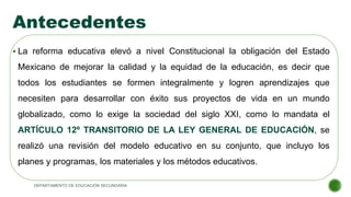 El documento describe los principales componentes del nuevo modelo educativo de México implementado después de la reforma educativa. El modelo se centra en lograr el máximo aprendizaje de todos los estudiantes y se basa en cinco ejes: un plan de estudios articulado, escuelas autónomas y centradas en el aprendizaje, formación y desarrollo docente continuo, inclusión y equidad, y una gobernanza participativa del sistema educativo.