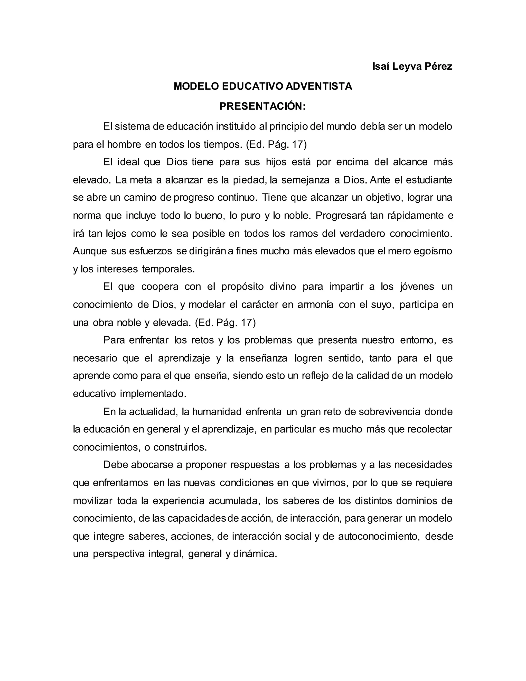 El documento describe los elementos esenciales del modelo educativo adventista, incluyendo que (1) el sistema de educación establecido en el Edén debía ser un modelo para la humanidad, (2) el rol del docente adventista es evidenciar el amor de Cristo y estar comprometido con Dios, y (3) el perfil del estudiante adventista incluye el desarrollo espiritual, físico, intelectual y social.