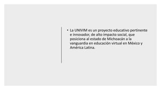 La UNIVIM es un proyecto educativo innovador en Michoacán, México que ofrece educación de calidad a través de un modelo educativo flexible y basado en tecnología. Su misión es brindar educación de acuerdo a las necesidades regionales y su visión es ser una de las principales universidades reconocidas por la calidad de sus programas y egresados. El modelo pedagógico se enfoca en desarrollar competencias a través de la guía de tutores, contenidos digitales y tecnologías de la información.