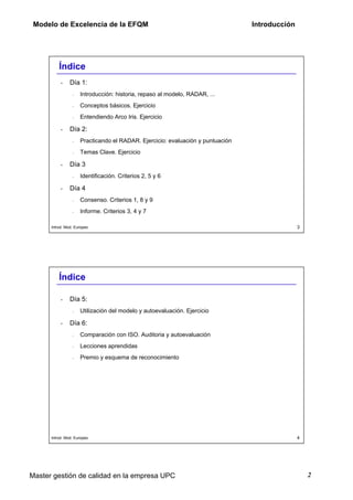Este documento presenta el Modelo Europeo de Excelencia de la EFQM. Explica que la EFQM fue fundada en 1988 por 14 empresas europeas para promover la excelencia empresarial a través de la gestión de la calidad total. Describe los 9 criterios del modelo, incluidos los facilitadores (liderazgo, política, personas, alianzas, recursos) y los resultados (personas, clientes, sociedad, clave). También resume los usos principales del modelo, como la autoevaluación y el desarrollo estratégico.