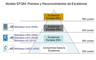 El documento presenta el Modelo EFQM de Excelencia, desarrollado por la Fundación Europea para la Gestión de Calidad. El modelo no es prescriptivo y está formado por nueve criterios agrupados en facilitadores y resultados, que permiten evaluar a las organizaciones. El modelo busca la mejora continua mediante la autoevaluación y comparación con otras organizaciones.