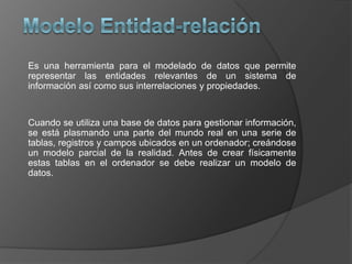 Este documento describe los conceptos fundamentales de un modelo de datos, incluyendo entidades, atributos y relaciones. Una entidad representa un objeto del mundo real sobre el cual se almacenará información, como una persona o lugar. Las entidades tienen atributos que son sus características, como el nombre o dirección. Las relaciones muestran las asociaciones entre entidades, como la relación entre un empleado y la empresa para la que trabaja. Juntos, las entidades, atributos y relaciones forman un esquema que modela parte de la realidad en una base de datos