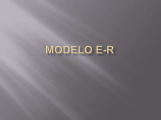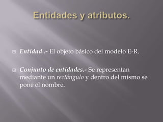 El documento describe los conceptos básicos del modelo entidad-relación (E-R), incluyendo entidades, atributos y relaciones. Las entidades pueden ser fuertes o débiles y los atributos pueden ser simples, compuestos, monovaluados o multivaluados. Las relaciones se representan mediante rombos y pueden ser opcionales u obligatorias dependiendo de si todas las entidades deben estar relacionadas o no.