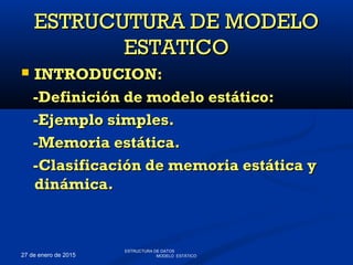 El documento introduce el modelo estático y la memoria estática. Explica que la memoria estática se reserva en la compilación antes de ejecutar el programa y reserva una cantidad máxima de memoria que a menudo no se necesita. También clasifica la memoria en estática y dinámica, y automática y no automática. Finalmente, presenta un ejemplo de aplicación funcional de vectores y matrices en memoria estática.