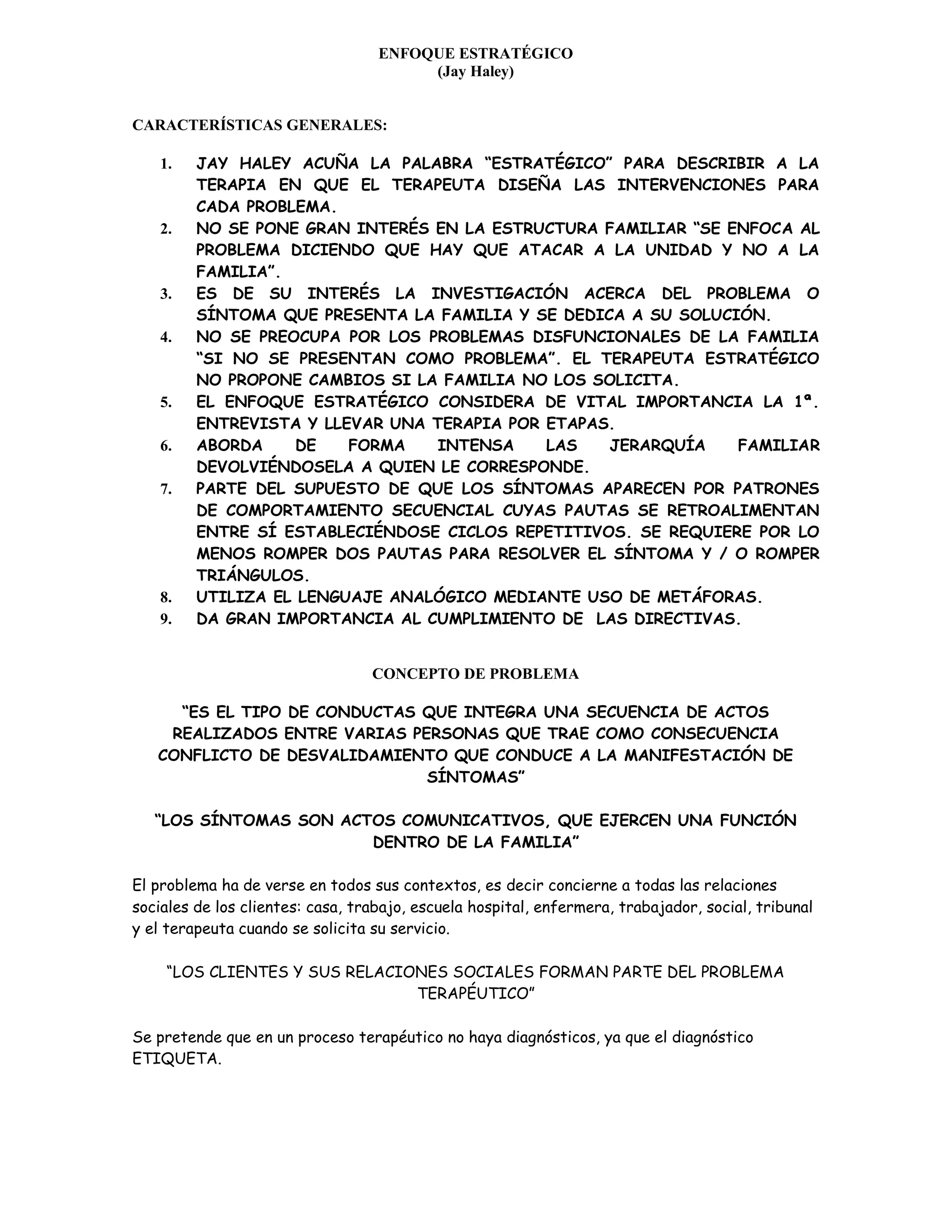 El enfoque estratégico de Jay Haley se centra en diseñar intervenciones para cada problema específico en lugar de en la estructura familiar. El terapeuta investiga el problema o síntoma presentado y se dedica a su solución, sin preocuparse por otros problemas disfuncionales a menos que se presenten como tal. La primera entrevista es vital e incluye cuatro etapas: social, planteamiento del problema, interacción y definición de los cambios deseados.