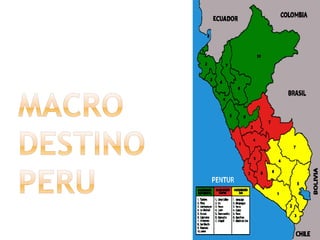 El documento describe los lineamientos para el desarrollo de destinos turísticos a nivel regional en Perú. Señala que cada destino debe contar con un ente gestor reconocido, definir su vocación y política turística en coordinación con el MINCETUR, y delimitar su territorio. Además, cada destino debe desarrollar productos turísticos competitivos basados en su potencial y proponer una oferta principal de venta acorde a su identidad.