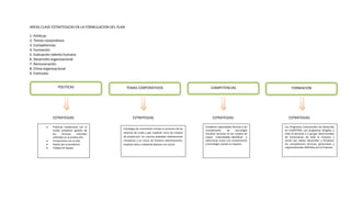 El documento resume la estrategia de gestión del talento humano de Ecopetrol S.A. Tiene como misión cerrar brechas internas para ser una organización ágil y eficiente, garantizando la gestión de activos estratégicos como el talento humano. Sus objetivos incluyen desarrollar un esquema de compensación competitivo y crear una cultura alineada con la estrategia de la empresa. Las áreas clave estratégicas son políticas, temas corporativos, competencias, formación, evaluación de talento humano, desarrollo