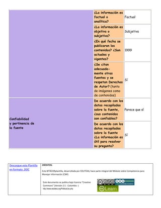 Este documento presenta una matriz de evaluación para analizar fuentes de información en internet. La matriz incluye secciones para evaluar las características del sitio web, la información sobre el autor, las características de los contenidos, y la confiabilidad y pertinencia de la fuente. La matriz provee una guía para sistemáticamente analizar quién publica la información, el propósito del sitio web, la audiencia, la fecha de publicación de los contenidos, y si la información es confiable y útil para resolver la pregunta planteada.