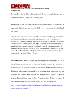 El documento describe el Plan Jena, un plan educativo creado en 1924 por el pedagogo alemán Peter Petersen para las escuelas de Jena, Alemania. El Plan Jena organizaba a los estudiantes en grupos por edades y proponía la libertad de movimiento de los estudiantes y la promoción de actividades espontáneas. Además, sustituía las clases tradicionales por grupos de trabajo y pretendía cambiar el mobiliario escolar tradicional.