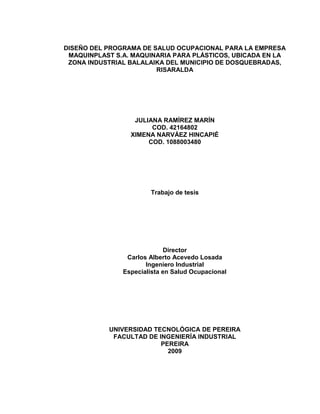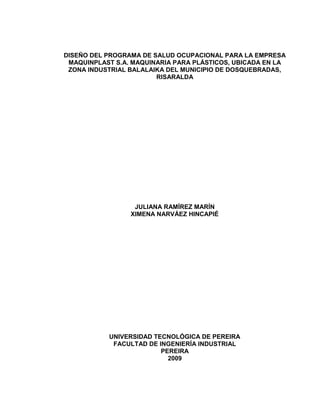 La empresa MAQUINPLAST S.A. se dedica a la fabricación de maquinaria para plásticos. Se realizó un diagnóstico de las condiciones laborales y de salud que identificó varios riesgos ocupacionales. Se propone diseñar e implementar un Programa de Salud Ocupacional con políticas, un Comité Paritario de Salud Ocupacional y actividades para los subprogramas de Medicina Preventiva, Medicina del Trabajo e Higiene y Seguridad Industrial para prevenir riesgos y proteger la salud de los trabajadores.