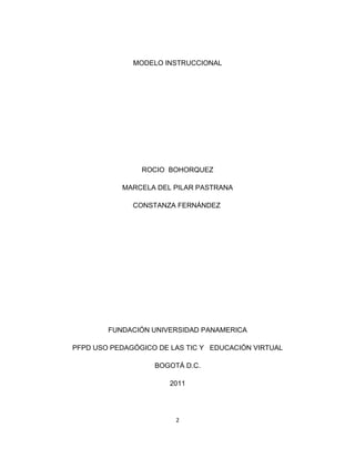 Este documento presenta un modelo instruccional para enseñar sobre los Derechos Humanos a estudiantes de noveno grado utilizando herramientas de la Web 2.0. El modelo propone estrategias como elaborar una línea de tiempo sobre la historia de los derechos humanos y realizar una presentación sobre la violación de derechos en Colombia. El objetivo es que los estudiantes reconozcan la importancia e historia de los derechos humanos aplicando herramientas digitales. El modelo se basa en el aprendizaje cooperativo y proyectos para
