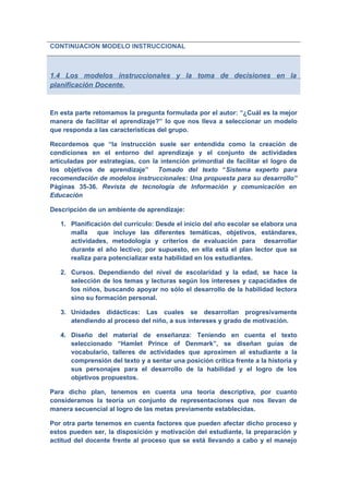 El documento describe los modelos instruccionales y cómo se pueden usar para facilitar el aprendizaje. Explica que el modelo debe seleccionarse en función de las características del grupo de estudiantes. También describe un ambiente de aprendizaje ideal que incluye la planificación del currículo, cursos, unidades didácticas y materiales de enseñanza diseñados. Finalmente, discute cómo los sistemas expertos y las nuevas tecnologías pueden aplicarse para facilitar estrategias didácticas efectivas.