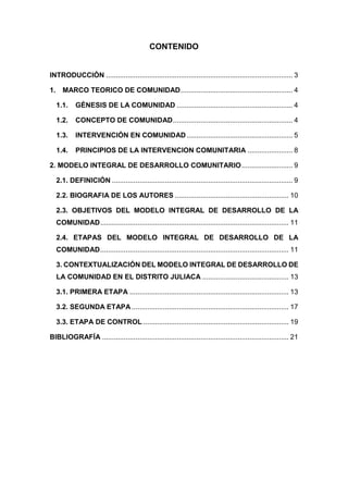 Este documento describe el modelo integral de desarrollo comunitario. Explica el concepto de comunidad, la intervención comunitaria y sus principios. Luego, define el modelo integral como un proceso sistémico e integrador que busca el bienestar humano y el equilibrio ambiental a través de la participación local. Finalmente, contextualiza el modelo en el distrito de Juliaca, Perú, describiendo sus tres etapas de implementación.