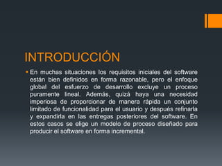 Este documento describe el modelo de desarrollo de software incremental e iterativo. Este modelo se basa en la repetición de etapas de desarrollo como análisis, diseño e implementación en incrementos sucesivos, con el objetivo de entregar versiones del software de manera continua que incorporen nuevas funcionalidades con base en la retroalimentación obtenida. El modelo busca resolver problemas de manera incremental para reducir riesgos y obtener beneficios tempranos para el usuario.
