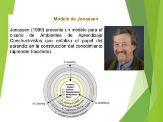 El modelo de Jonassen para el diseño de ambientes de aprendizaje constructivistas enfatiza el aprendizaje mediante la solución de problemas y el desarrollo conceptual. Los elementos clave del modelo son presentar preguntas o proyectos a los estudiantes, proveer recursos y herramientas cognitivas, y apoyar la colaboración y discusión para que los estudiantes construyan el conocimiento de manera activa.