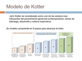 El documento describe el modelo de Kotter de 8 pasos para lograr el éxito en el cambio organizacional, que incluye crear un sentido de urgencia, formar una poderosa coalición, crear una visión para el cambio, comunicar la visión, empoderar a otros para actuar en la visión, planificar y crear victorias cortoplacistas, consolidar las mejoras y anclar los nuevos aproximaciones en la cultura. También describe la evolución del marketing mix tradicional de 4P (producto, plaza, precio y promoción) a las 4C (cliente,