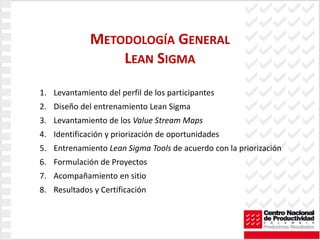 El documento describe la metodología general del modelo Lean Six Sigma (Green Belt Certification), que incluye levantar perfiles de participantes, diseñar el entrenamiento, mapear los flujos de valor, identificar oportunidades, entrenar en herramientas, formular proyectos, dar seguimiento en sitio y certificar resultados. Se muestran ejemplos de mapas de flujo de valor y herramientas como 5S, SMED y DOE. El modelo ofrece resultados a corto y largo plazo, retorno de inversión y eleva las competencias del personal a