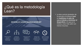 La metodología Lean se enfoca en maximizar el valor para el cliente y minimizar el desperdicio. Sus principios incluyen eliminar el desperdicio, crear conocimiento a través del desarrollo de productos, entregas rápidas de alta calidad a bajo costo, y optimizar todos los procesos para producir más con menos recursos.