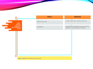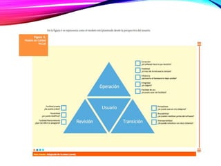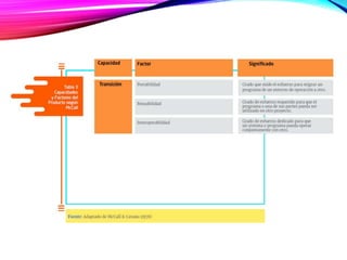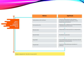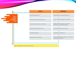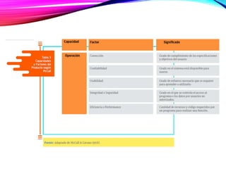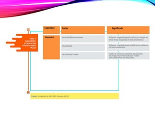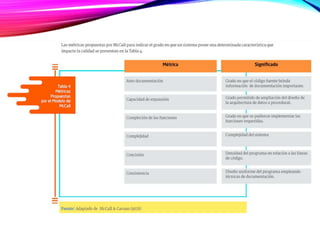 El modelo McCall describe la calidad de un producto software descomponiendo el concepto genérico de calidad en tres capacidades principales desde la perspectiva del usuario: capacidad de operación, capacidad de transición y capacidad de revisión. Cada capacidad se descompone en factores como corrección, confiabilidad, usabilidad, etc. Los factores luego se definen y evalúan a través de métricas específicas. El modelo McCall es fijo y para evaluar la calidad de un producto se selecciona un subconjunto de factores y métricas dispon