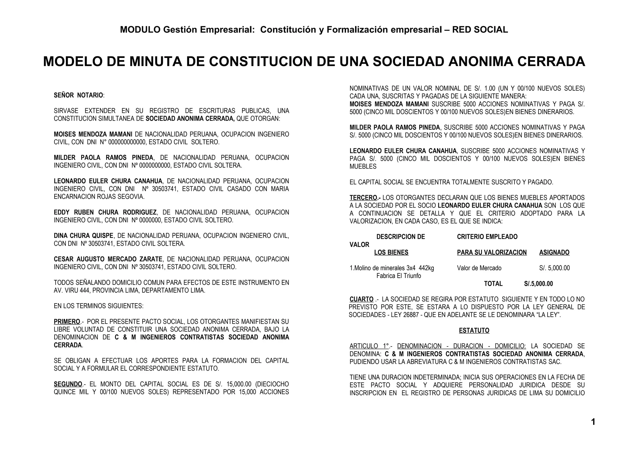 Este documento presenta un modelo de minuta para constituir una sociedad anónima cerrada. Incluye la información de los socios fundadores, el capital social suscrito y pagado, los aportes de cada socio, la designación del primer gerente general, y los estatutos que regirán la sociedad en aspectos como su denominación, duración, objeto social, órganos de gobierno y facultades.