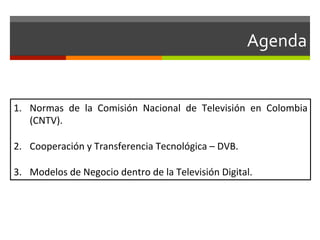 El documento analiza la transición de la televisión analógica a digital en Colombia bajo la regulación de la Comisión Nacional de Televisión (CNTV), destacando la implementación gradual de una red de televisión digital terrestre (TDT) para alcanzar un 85% de cobertura. También aborda la cooperación y transferencia tecnológica con modelos de negocio emergentes en el sector, enfatizando la importancia de la innovación y el desarrollo de contenidos interactivos. Se mencionan diversas propuestas de colaboración internacional para fortalecer la infraestructura y la oferta de servicios de televisión digital en el país.