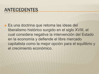 El documento describe los antecedentes y características del modelo neoliberal implementado en México a partir de la década de 1980. Señala que el neoliberalismo retoma ideas del liberalismo económico del siglo XVIII favoreciendo el libre mercado y reduciendo la intervención estatal. Explica que México adoptó este modelo para enfrentar una crisis económica y poder acceder a fondos del FMI y el Banco Mundial. Incluye detalles sobre los planes y programas aplicados durante el gobierno de Miguel de la Madrid, centrándose