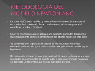 El documento describe el método científico, que implica la observación de la realidad para establecer una ley o hipótesis, la deducción de resultados particulares de la ley, y la verificación experimental de los resultados deducidos para validar la ley. Dos ejemplos de leyes son la ley de la inercia y la ley de la fuerza y el movimiento.