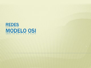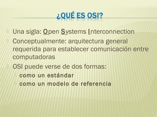 El documento describe el modelo OSI (Open Systems Interconnection), un estándar desarrollado en la década de 1980 para establecer comunicaciones entre computadoras. El modelo OSI consta de 7 capas que dividen el proceso de comunicación en niveles funcionales. Cada capa ofrece servicios a la capa superior y utiliza servicios de la capa inferior, permitiendo la transmisión de mensajes entre nodos de red de manera ordenada y estandarizada.
