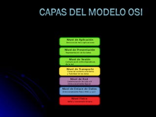 El documento describe las diferentes capas del modelo OSI de interconexión de sistemas. La capa física se encarga de las conexiones físicas y del medio de transmisión de datos. La capa de enlace de datos gestiona el direccionamiento, la topología de red y el control de flujo. La capa de red se ocupa de encaminar los datos desde el origen hasta el destino a través de routers. La capa de sesión mantiene la conexión entre los computadores y controla la concurrencia. La capa de presentación se encarga de la